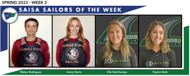 ST. PETERSBURG, FL., (February 25-26, 2023) – Florida State University skipper Mateo Rodriguez (Sr., Winter Haven, FL) and crew Avery Harris (So., DeLand, FL) are the SAISA Open Sailors of the Week after leading the Seminoles to a victory at the Eckerd Interconference Regatta this past weekend, as well as posting the low score for the regatta, winning A-Division with a scoreline nearly half of the second place Princeton Tigers. Out of 16 races across two days, Rodriguez and Harris earned 9 bullets, 6 second-place finishes and no finishes worse than 4th on the weekend. Across the peninsula in Daytona Beach at the SAISA South Spring Tournament for the Gregg Popp Trophy hosted by Embry Riddle, Jacksonville women’s skipper Ella DesChamps (So., Wilmington, NC) and crew Payton Ruth (Fr., South Bend, IN) earned SAISA Women’s Sailors of the Week honors after winning B-Division and helping the Fins secure second overall in the regatta. DesChamps and Ruth started the event with three bullets, undefeated in the first rotation and earned podium finishes in two of the final three races and no finish worse than 4th for the event. Congratulations to this week’s SAISA Sailors of the Week!